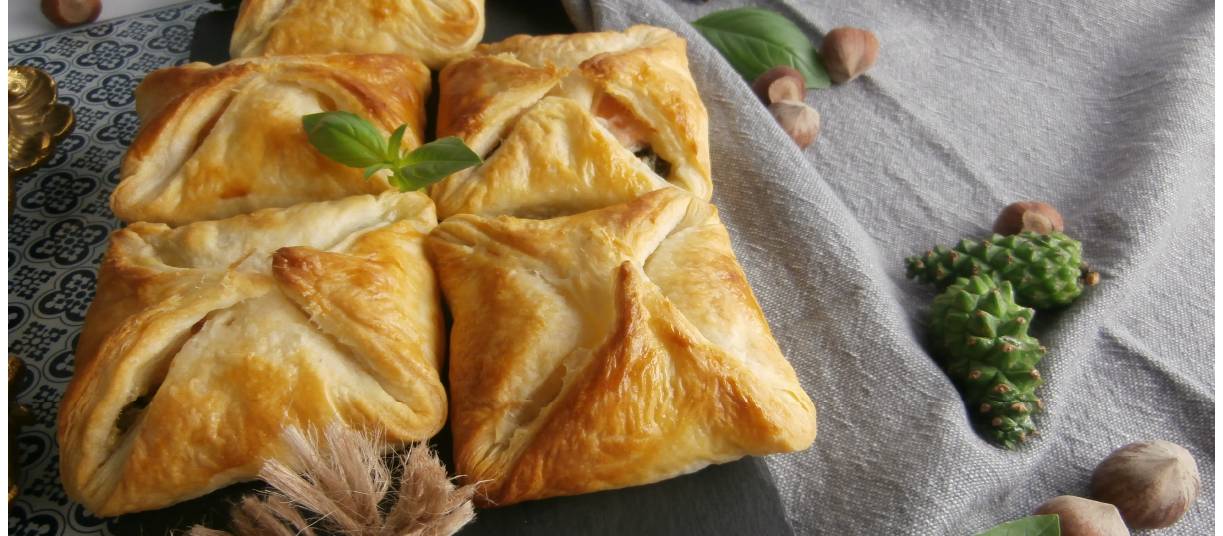 4. Lightly flour your work surface and roll out each sheet of puff pastry to the thickness of a €2 coin. Cut each sheet into 9 squares